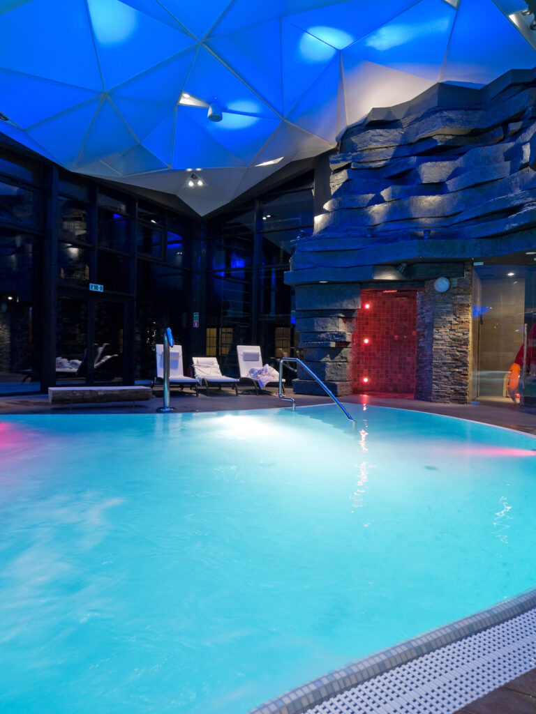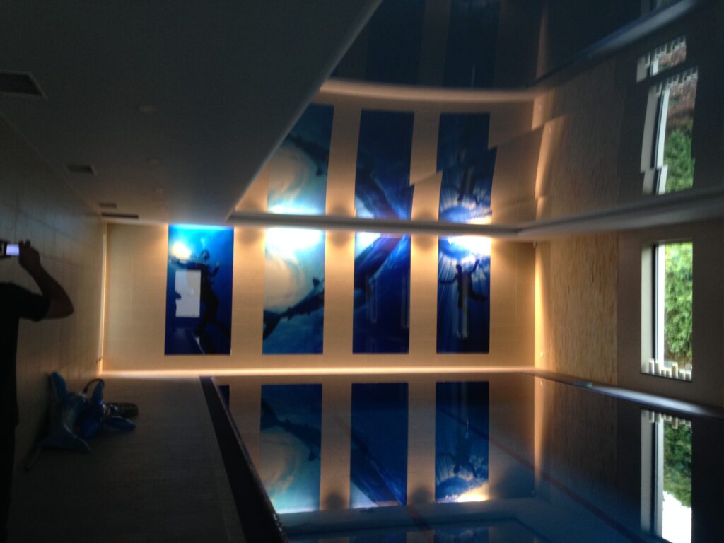 Montaż sufitu z nadrukiem nad basenem