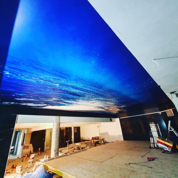 Montaż sufitu z nadrukiem w showroom